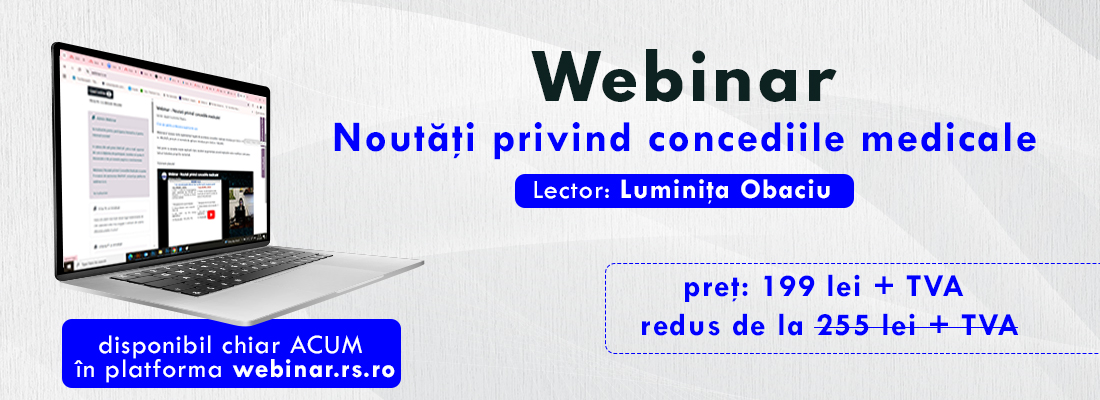 Titlu:Noutati privind concediile medicale! Lector: expert Luminita Obaciu Webinar disponibil chiar acum in platforma webinar.rs.ro (inregistrat pe 31 martie 2026) Durata webinar: 120 minute Pret: